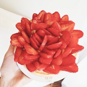 Exquisita y fresca tarta de frutillas, realizada con una masa quebrada sablée, una fina capa de dulce de leche terminada con crema chantilly.